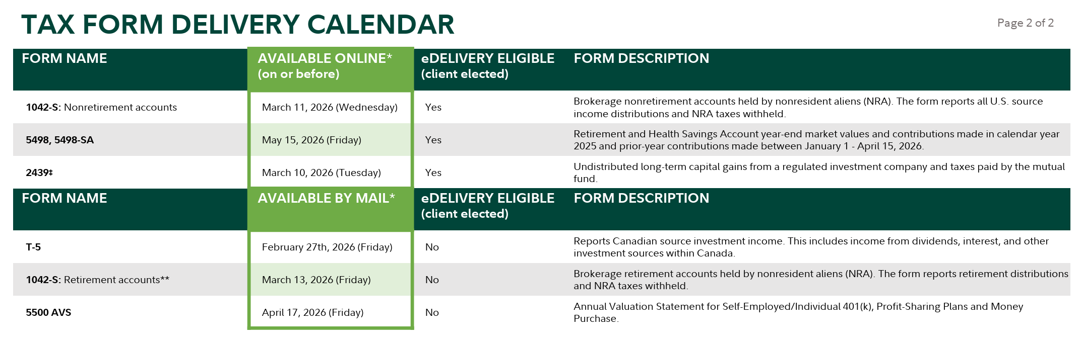If a client has NOT elected eDelivery for their tax documents, they can expect to start receiving them in the mail 7-10 days after the Available Online date listed on the calendar above.